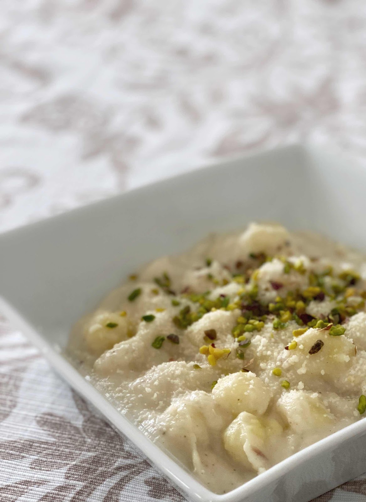 Il risultato: gnocchi morbidissimi avvolti da questa fonduta vellutata e delicata. Una manicatina di pistacchi tritati per dare croccantezza ed il piatto e fatto.